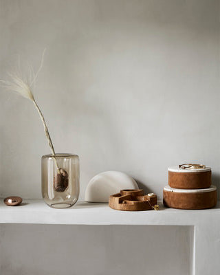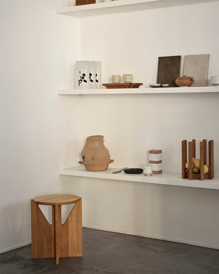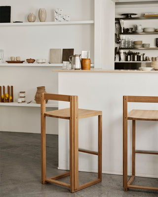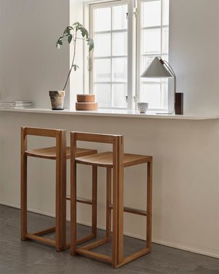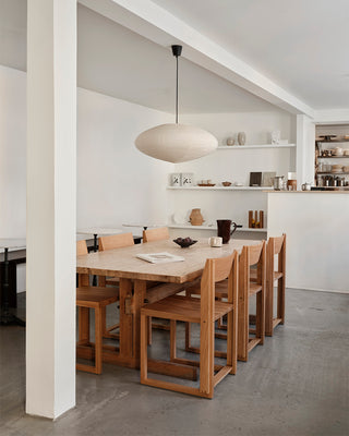 Der rohe Raum mit Betonböden ist geschmackvoll in verschiedene Zonen gegliedert und fremhæbt natürliche Materialien wie Eiche, Stein und Edelstahl, die dem Ort eine minimalistische, vom japanischen Design inspirierte Atmosphäre verleihen. Schwebende Regale präsentieren eine Auswahl lokal gefertigter Keramiken und Kunstwerke, ergänzt durch unsere charakteristische Column Bowl aus geölter Eiche.